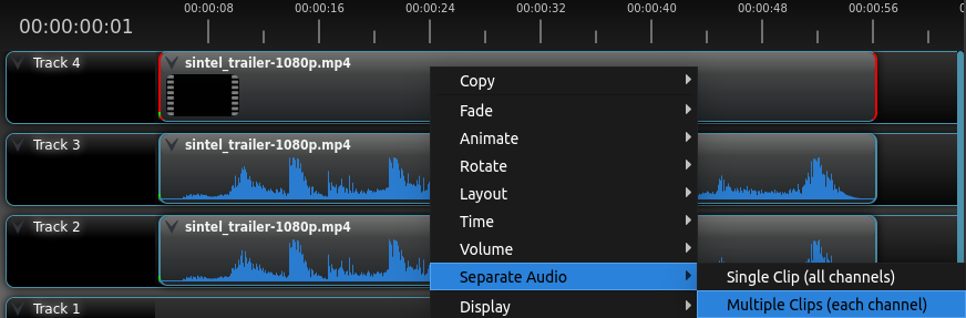 OpenShot now supports the ability to display audio waveforms on clips, swap audio channels, as well as separating audio into another clip (or multiple clips - one per channel). This opens up lots of interesting flows, such as adjusting the volume of individual audio channels, removing certain channels, or easily fixing audio drift.