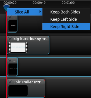 I've extended the slice feature to work across all tracks, by right clicking on the playhead icon. You can use this to quickly slice all clips and transitions at the exact same spot, and keep the left side, right side, or both sides. And by using the new Keyboard shortcuts, this can also be done without using a mouse.