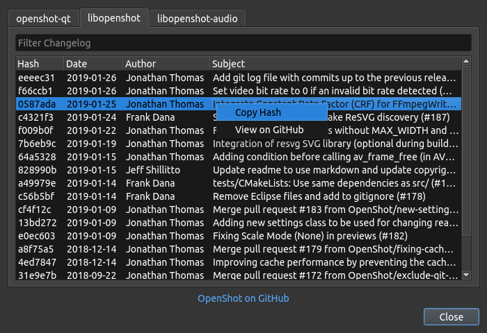 Do you ever wonder what changes are included in your currently installed version of OpenShot? Now you can find out! Use the Help->About OpenShot->Changelog dialog, and you can quickly see what commits, the date of each commit, and you can even right click and view the GitHub commit information. I know I might be the only person excited by this, but yay!